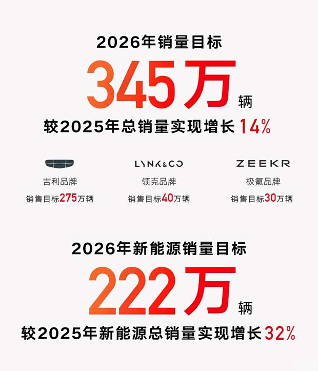 荣耀收官!吉利汽车2025年全年累计销量超302万辆,超额完成全年销售目标,2026年冲击总销量345万辆!