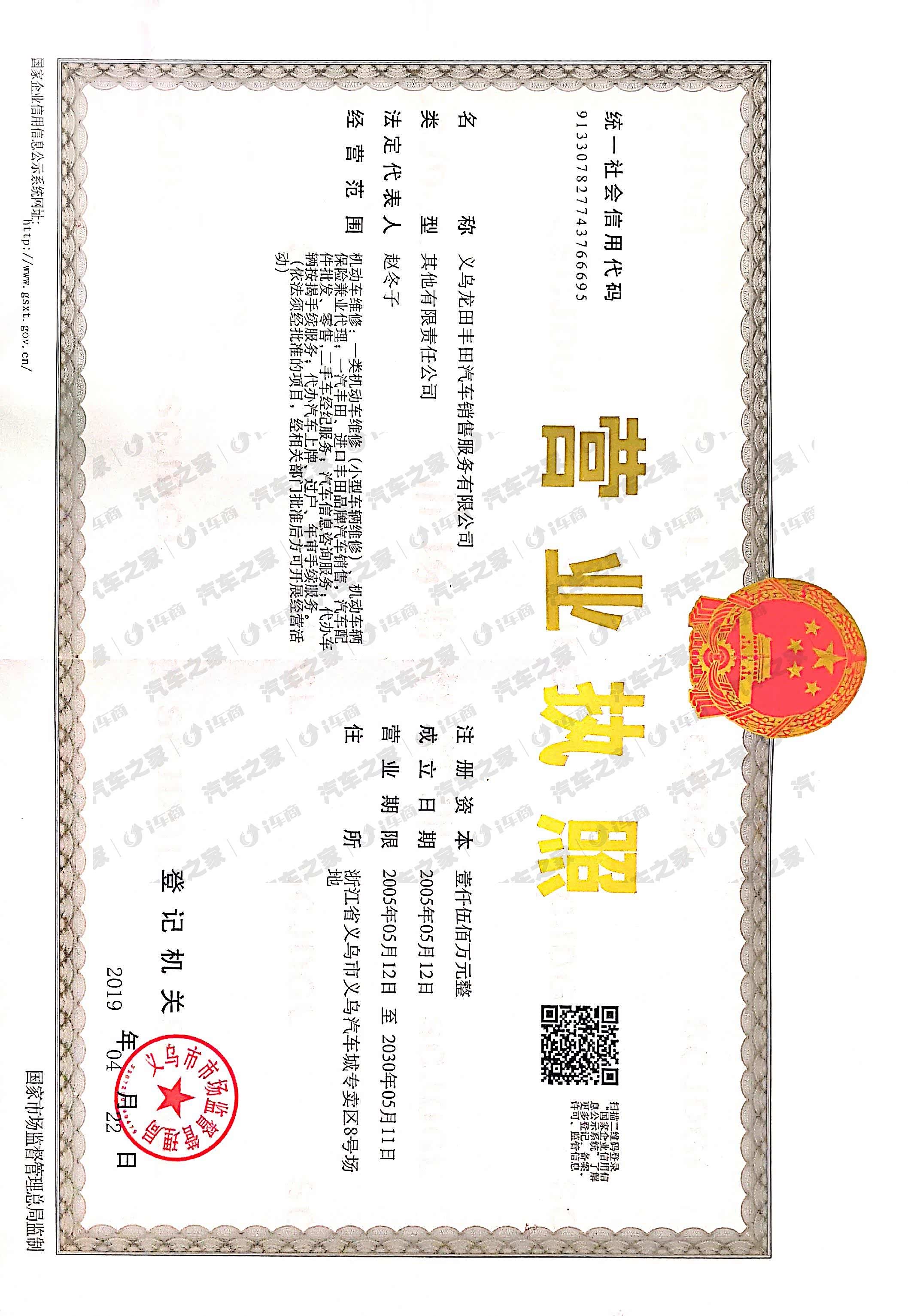 义乌龙田丰田汽车销售服务有限公司是由义乌著名企业赵龙集团有限公司投资组建,经一汽—丰田有限公司授权的丰田4S专营店。公司位于义乌恒风国际汽车城8号场地,注册资金1500万元。投资总额4500万元。本公司购车环境优雅,办公设施及维修设备一流,集整车销售、配件供应、信息反馈、售后服务为一体的4S专营店,我公司将竭诚为辖区内的消费者提供全球一致的人性化细致服务。