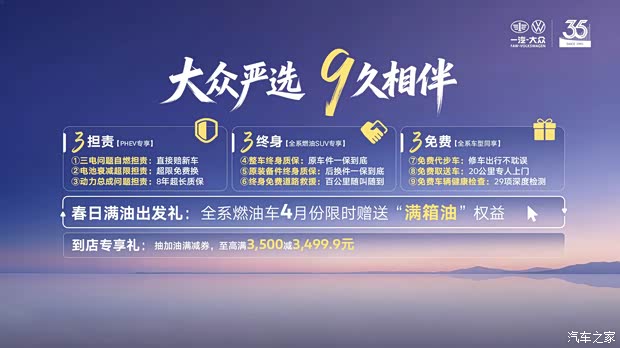 买车不仅是选一台车,更是选一份长久的安心与陪伴。一汽 - 大众 35 周年匠心钜献,「大众严选 9 久相伴」服务权益重磅升级,三重保障 + 多重春日福利,为每一位车主的出行保驾护航。