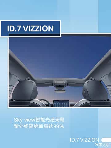 #众说好车##ID.7 VIZZION#Sky view智能光感天幕 ,满足视觉的空间感,可触控调节天幕变色,紫外线隔绝率高达99%。