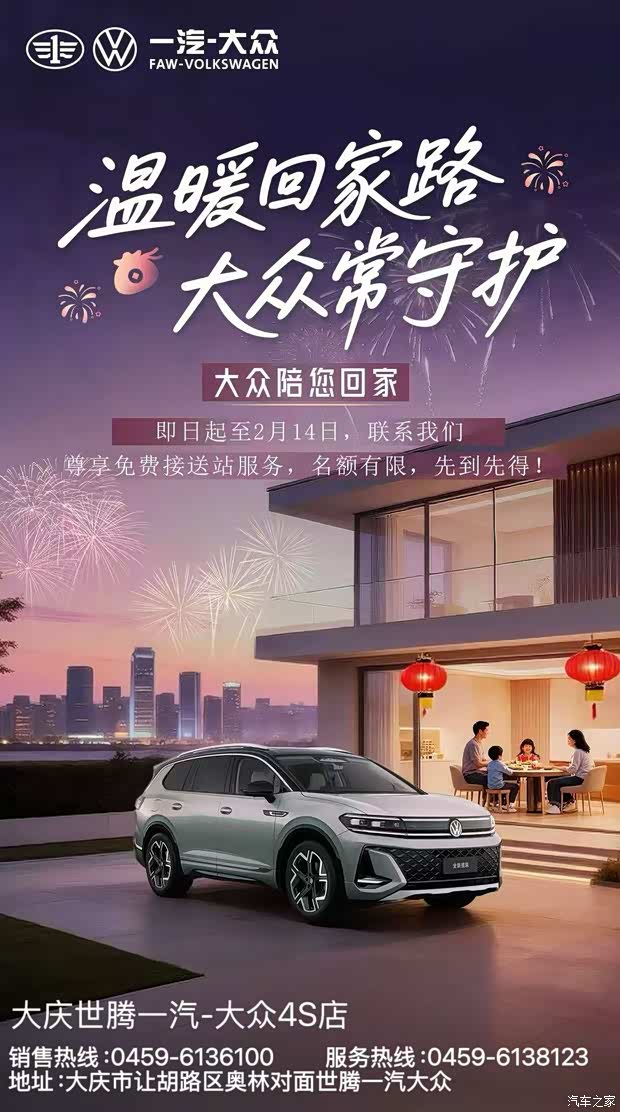 一汽大众温暖回家路,大众常守护 一汽-大众伴你奔赴团圆。 即日起至2月14日 大庆世腾一汽-大众为您送上专属暖意——免费接送站服务,名额有限,先到先得! 从城市喧嚣到家门灯火,每一段归途,都有大众的可靠守护;每一次启程,都藏着对家的热切期盼。 开年有好礼,归家有温度,这个春节,让大众陪你平安回家,共赴团圆之约。 大庆世腾一汽-大众4S店 地址:大庆市让胡路区奥林对面世腾一汽大众