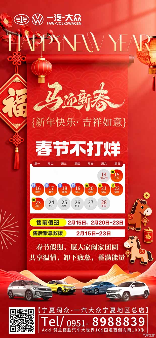 马迎新春,好车随行!一汽大众宁夏润众春节不打烊,售前帮你选 “千里马”,售后护你平安归途。愿你马到成功,驾享新年每一程!