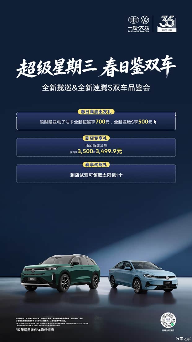 目前,「超级星期三 春日鉴双车」双车品鉴会正在火热进行中,名额有限,福利不等人。感兴趣的朋友可直接扫码预约,前往一汽 - 大众授权经销商展厅,解锁心仪座驾与专属福利,开启春日畅行新旅程!