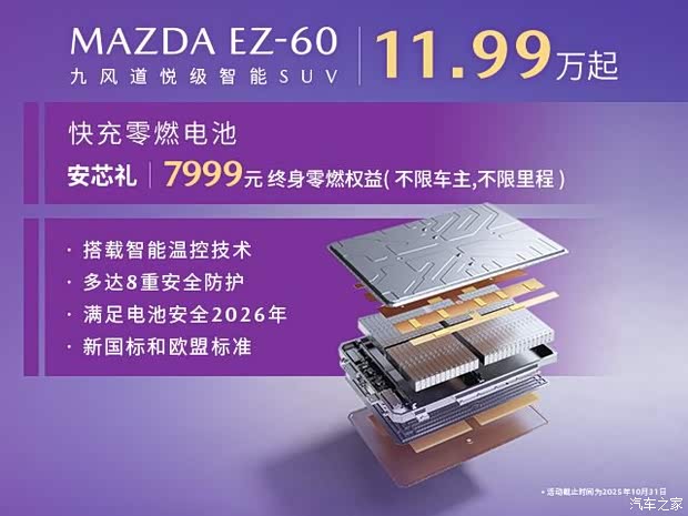 即日起至2025年11月30日下订购买长安马自达EZ家族车型,还可享价值7999元的终身零燃权益,不限车主,不限里程。同时还可享车型专属豪礼!