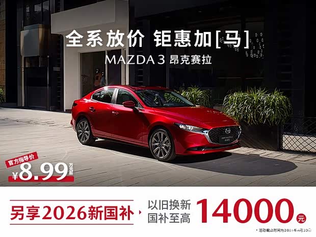 即日起至2026年3月31日,下订购买长安马自达昂克赛拉车型,除新国补外还可享限时三重礼!