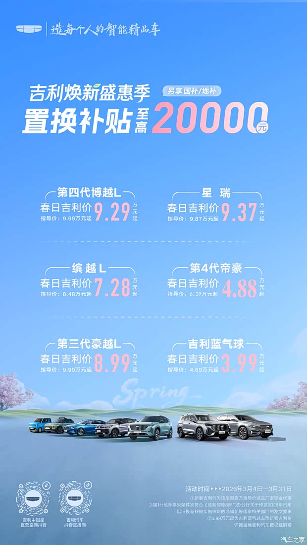 暖春焕新,购车正当时🔥吉利汽车 3 月焕新盛惠季重磅来袭置换补贴至高20000 元多重福利叠加,购车超划算!
