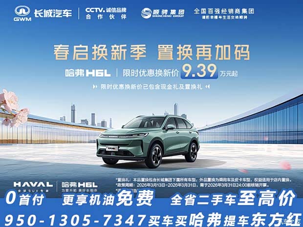 *7年低租息为个人融资租赁产品,首期款/月租以哈弗H6L1.5TPro建议零售价享受现金优惠后计算;0息产品为个人零售信贷产品;以上产品由长城滨银汽金提供
