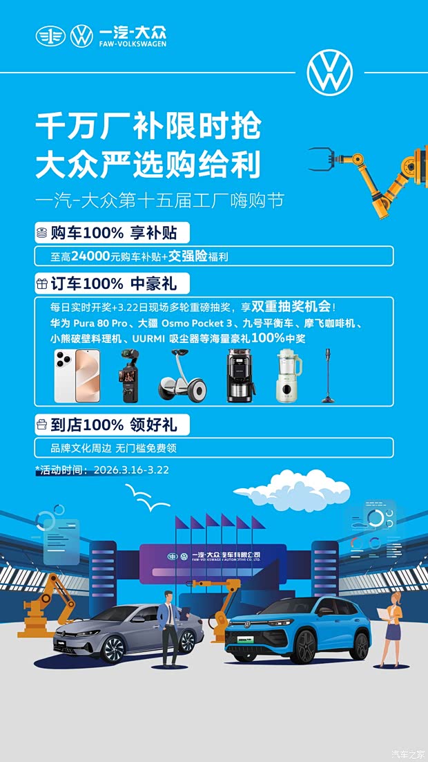 和利大众2026-03-16 11:02 · 阜新 一汽-大众第十五届工厂嗨购节来啦!