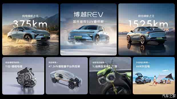 博越REV 实现了CLTC 纯电续航375km,达到同级主流水平两倍,满足日常通勤两周零油耗;综合续航1525km,长途跨省无需频繁补能,真正实现全场景出行自由。超级铂金增程系统以高集成、轻量化、高能效为内核,打造高效可靠的增程动力架构。行业首发11合1增程电驱系统,高度集成11大核心部件,结构更紧凑、重量更轻,馈电与满电动力无落差,持续输出2.0T级强劲性能。增程器搭载阿特金森循环、EGR技术与“御风火龙卷”高效燃烧系统,12项关键技术加持,热效率高达47.26%,1L油可高效发电3.77度,馈电油耗低至4.95L/100km,油电转化效率行业领先。智能多域协同控制,实现增程器无感启停、平顺介入,始终高效运转,馈电状态下仍可输出180kW功率,轻松支持155km/h高速巡航,动力不衰减、节能与性能兼得。