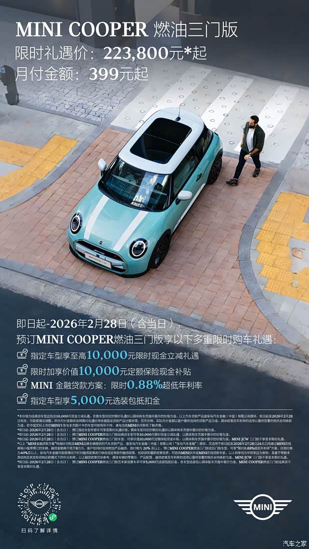 MINI COOPER 燃油三门版 限时礼遇价223,800元起 月付金额399元 预订享多重限时购车礼遇