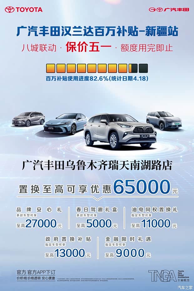 此次活动,汉兰达提供了至高65000元的综合优惠,这无疑是购车的时机!目前,百万补贴使用进度已达82.6%,机会稍纵即逝,您还在等什么?赶紧拨打我们的商家电话4009303614咨询详情吧!