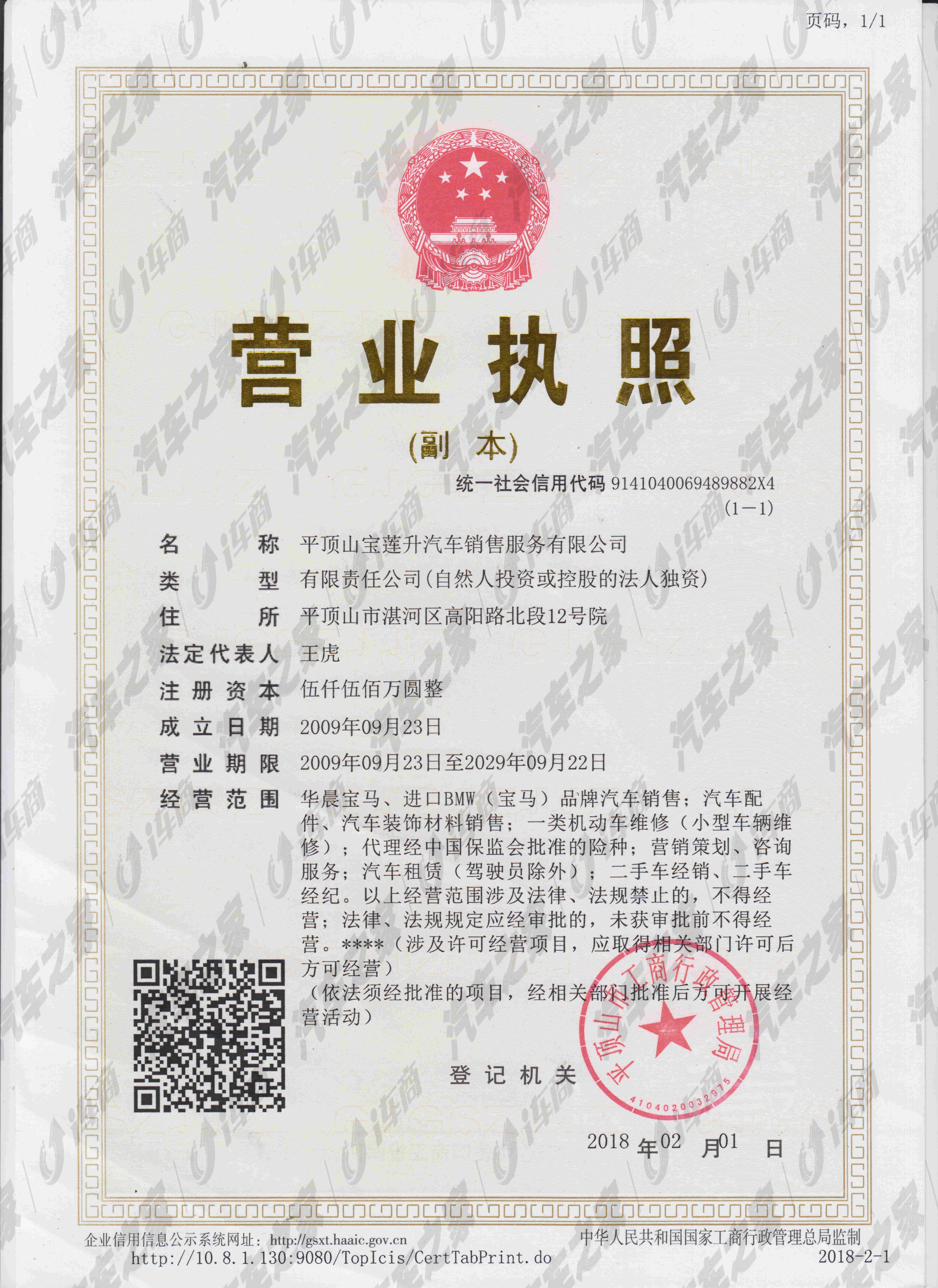 平顶山宝莲升汽车销售服务有限公司隶属于河南省大型汽车销售集团之一--河南大行汽车集团有限公司,是宝马(中国)汽车贸易有限公司及华晨宝马汽车有限公司在河南省平顶山市的授权经销商。公司将提供BMW全线的车型的整车销售、售后维修、原厂备件、以及二手车置换、精品装饰、分期金融、保险代理等一条龙服务。