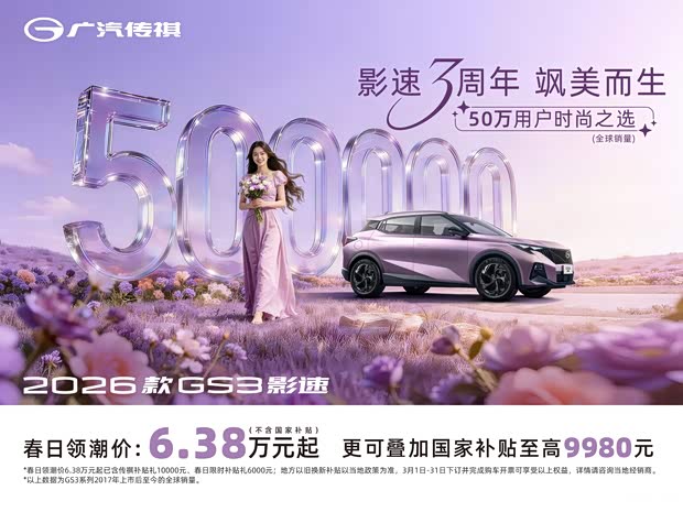 购【26款GS3影速】可享: 春日领潮价6.38万元起(不含国家补贴) 更可叠加国家补贴 智美流量礼:终身免费基础流量、3年免费娱乐流量(6G/月,无车联网功能车型除外) 【老友管家礼】 祺行无忧基金双倍膨胀权益