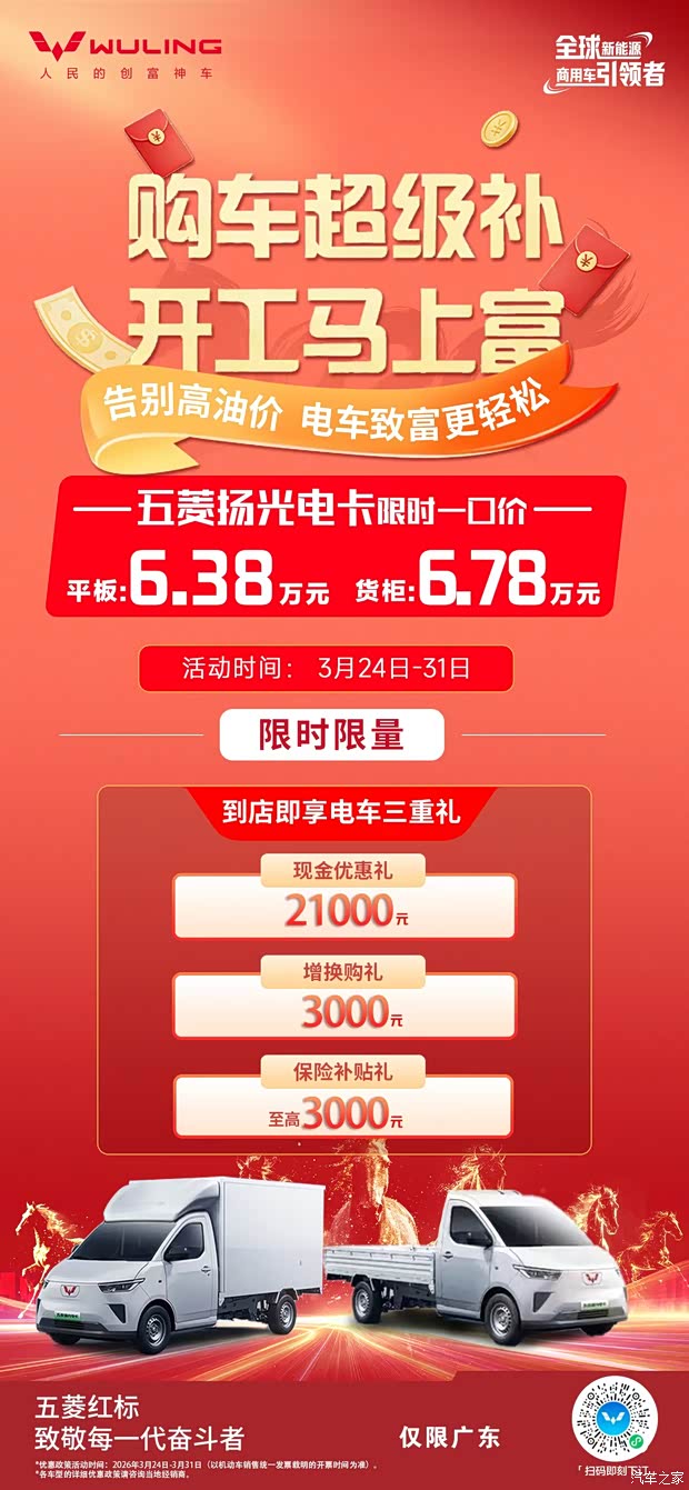 五菱红标新能源限时一口价:五菱之光EV 201KM 3.98万元起;五菱宏光EV 6.23万元起;扬光电卡6.68万元;门店地址: 广东省广州市白云区机场路888号东区三号楼一层广东五菱。