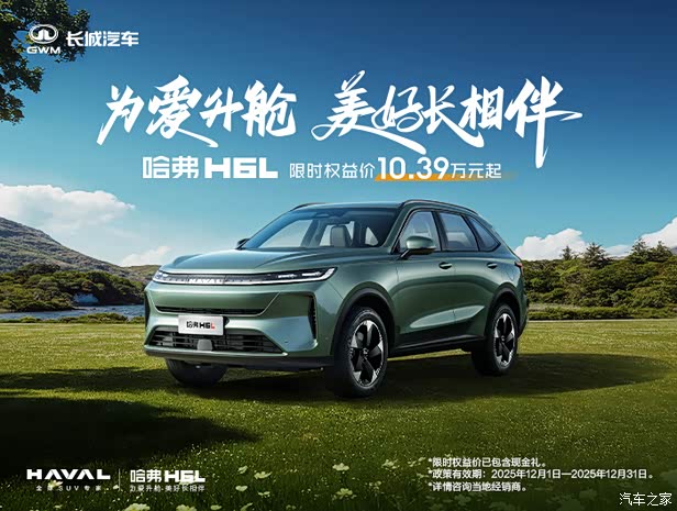为爱升舱越级而来,哈弗H6L重磅上市,自然律动美学设计天生就美;搭载Coffee OS 3智能座舱,应用生态更丰富,语音响应更速度;14.6英寸智慧中控屏清晰度更高、操控更流畅;高配车型搭载2.0T+9DCT动力组合更省更爽,WLTC百公里油耗仅7.4升,零百加速仅需7.4秒;前车窗静音玻璃,多功能双密度工学座椅。为爱升舱,舒享每一程。现在购车,享限时优惠价10.39万元起。
