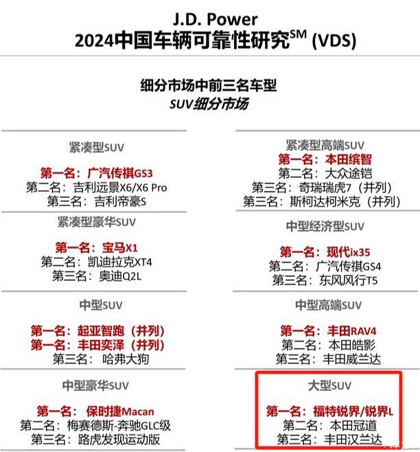 在2025年公布的J.D. Power 2024中国车辆可靠性研究SM(VDS)中,福特锐界L获得大型SUV可靠性第一名。在车辆实际出行体验上,第一批福特锐界L混动版车主有的行驶里程已超10万公里,行车足迹遍布中国大陆所有省份的各种地形地貌,经过10万公里的考验,福特锐界L各项功能正常稳定工作,实测总行程平均百公里油耗7.66L、每公里油费不到5毛9。刹车片、火花塞等磨损微小,平均每万公里保养费用不到360元,展现出福特锐界L的扎实制造水准和耐久性品质。