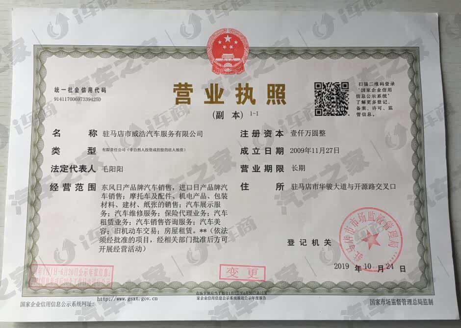 东风日产驻马店市威浩汽车服务有限公司隶属于河南威佳汽车集团,是集团旗下第十六家专营店按照高标准规划也是高起点建设的集销售、服务、配件及信息四位一体的现代化企业。地处驻马店市开源大道车管所东100米,总投资3000万元,其中固定资产投资约1300万元,建筑面积约6600多平方米,2010年5月29日正式开业。现有员工200余人。为了更好的服务广大客户,公司在各县城也开设了集销售与售后为一体的小型4S店。