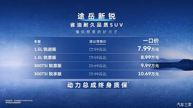 从途观L Pro到途岳新锐,上汽大众SUV战略布局强势发力,进一步表明上汽大众继续领跑燃油车领域、坚定实行“油电同进”的决心。一口价7.99万起、动力总成终身质保、省油耐久的越级实力,途岳新锐将以A级SUV市场新标杆之姿,为用户提供一步到位的用车体验,给予用户“天长地久”的陪伴和守护。