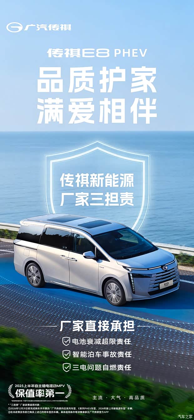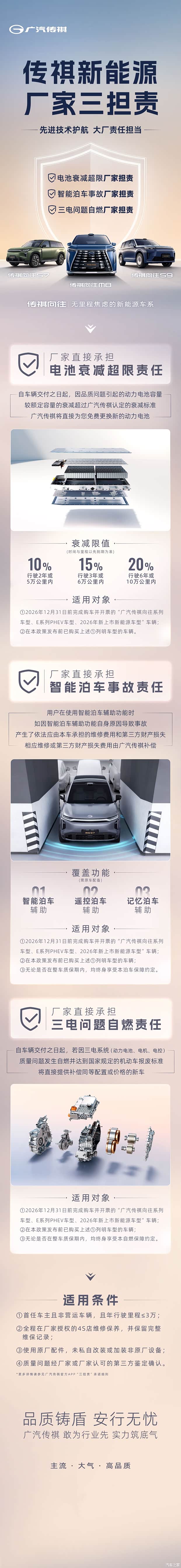 * 以上政策适用于 2026年12 月31日前完成购车并开票的广汽传祺向往系列/E系列PHEV车型、2026年新上市新能源车型的首任非营运车主,年行驶里程不超过3万公里(不同担责项目适用条件详见承诺细则)。