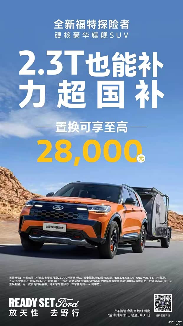 在这万物复苏的节点,全新福特探险者不仅是你探索春色的伙伴,更化身为你春日旅途的“助攻”。福特汽车现已重磅开启春游限时购车补贴活动,即日起至3月31日,购全新福特探险者享价值至高56,888元购车礼,实现“2.3T也能补”!更可享至高28,000元限时补贴,远超国补!针对备受关注的昆仑穿越版车型,更推出厂家限时补贴政策(详询当地经销商),只为让你在这个春天,轻装上阵,任性“趣野”。