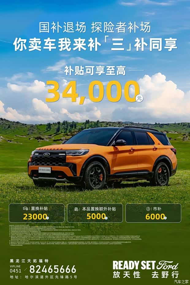福特汽车现己重磅开启春游眼时购车补贴活动,即日起至3月31日。购全新福特探险者座价值至高46,.888元购车礼,置换加“马”更可享至高21.500元裂时补贴,居然比国赴还要丰厚!针对备受关注的昆仑穿越版车型,更推出厂家限时补贴政策。只为让你在这个春天。轻装上阵,任性“趣野”。