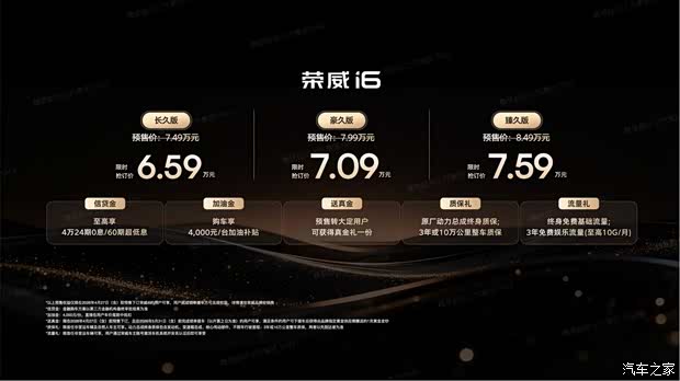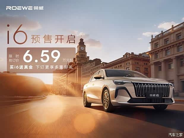 4月13日,国民级家轿荣威i6正式开启预售,共推出三款车型,分别是长久版、豪久版、臻久版,限时抢订价6.59万-7.59万,至高享4万24期0息/60期超低息,4,000元/台加油补贴,原厂动力总成终身质保。预售转大定,在5月底前锁单提车的用户送足金金钞。