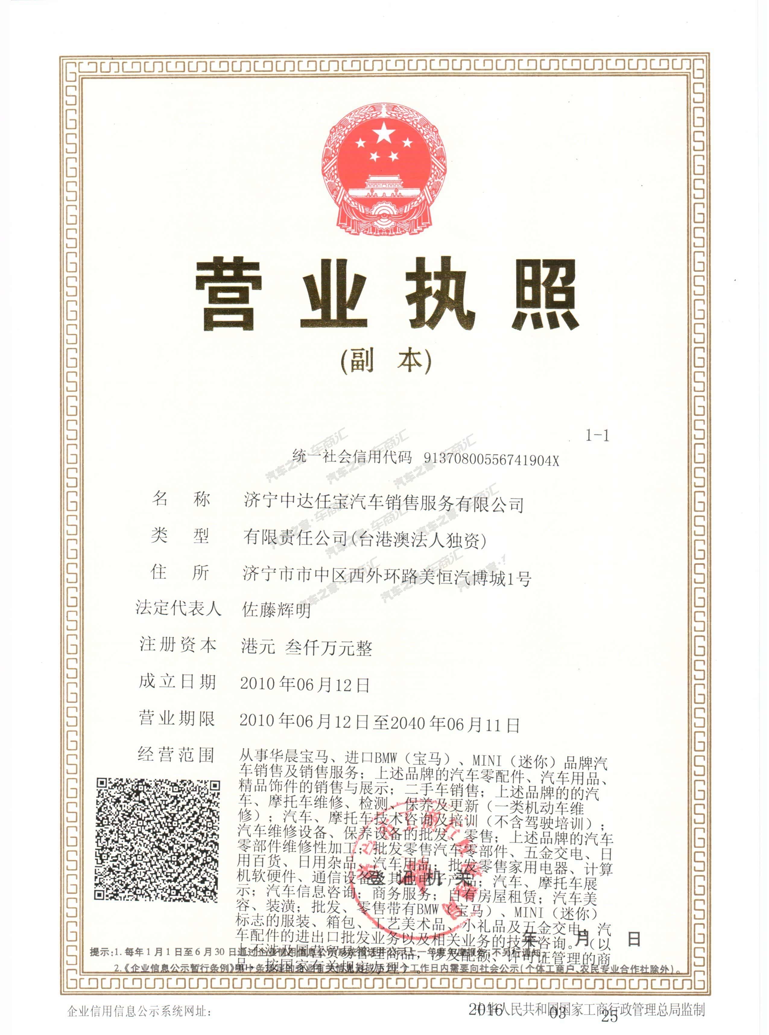 济宁中达任宝汽车销售服务有限公司,是由设立在香港的中达汽车有限公司全资控股的在济宁市设立的外资公司,注册资金3000万港币。是由德国宝马汽车集团和华晨宝马汽车有限公司授权在济宁地区的首家BMW&MINI授权经销商。