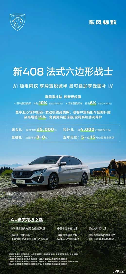 政策是诚意,车才是答案。此次参与补贴的东风标志新408与东风标致508L恰好代表了法系车的两张王牌。东风标致新408被誉为“法式六边形战士”,全系标配60项主流配置,第四代360THP发动机与爱信6AT变速箱带来强劲平顺的动力表现,至高1600MPa超高强度车身与儿童优先环保座舱,在安全与健康方面树立同级标杆。对于首购家庭与独立新锐派而言,这是一款入门即满配、品质看得见的高价值之选。