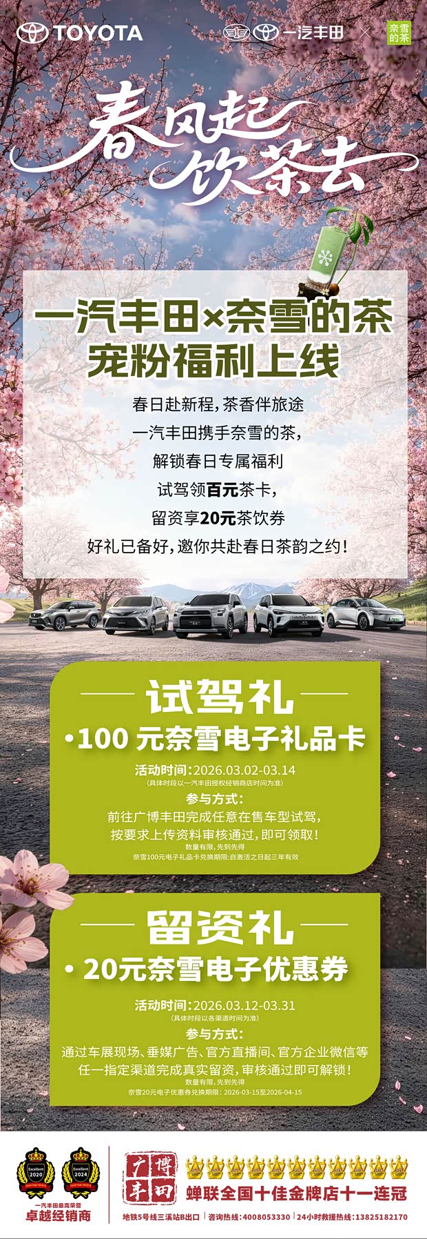 🌸 春风起,饮茶去🌸 ✨ 广博丰田 × 奈雪的茶春日宠粉福利上线✨ 🚗 试驾解锁 100 元奈雪电子礼品卡, 🎁 留资即享 20 元茶饮优惠券, 🌿 春日赴新程,茶香伴旅途, [强]广博丰田-您身边的丰田旗舰店 📍 地点:地铁5号线三溪站B出口 📞 咨询re线:40 0-80 5-33 30