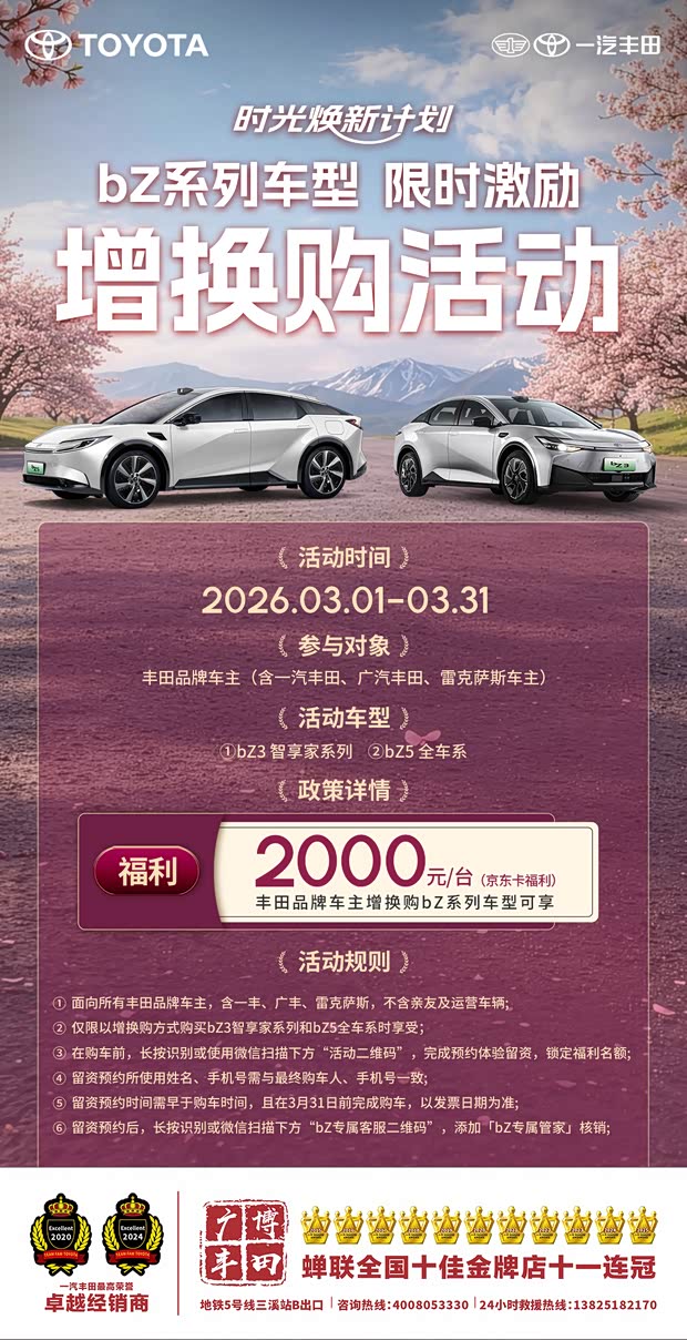 🔥一汽丰田bZ系列增换购限时激励开启 🚗丰田品牌车主(含一丰 / 广丰 / 雷车) 🚙增换购bZ3智享家系列、bZ5全车系 🎁立享2000元京东卡福利 ⏰3月1日-31日,限时开抢 [强]广博丰田-您身边的丰田旗舰店 📍 地点:地铁5号线三溪站B出口 📞 咨询re线:40 0-80 5-333 0