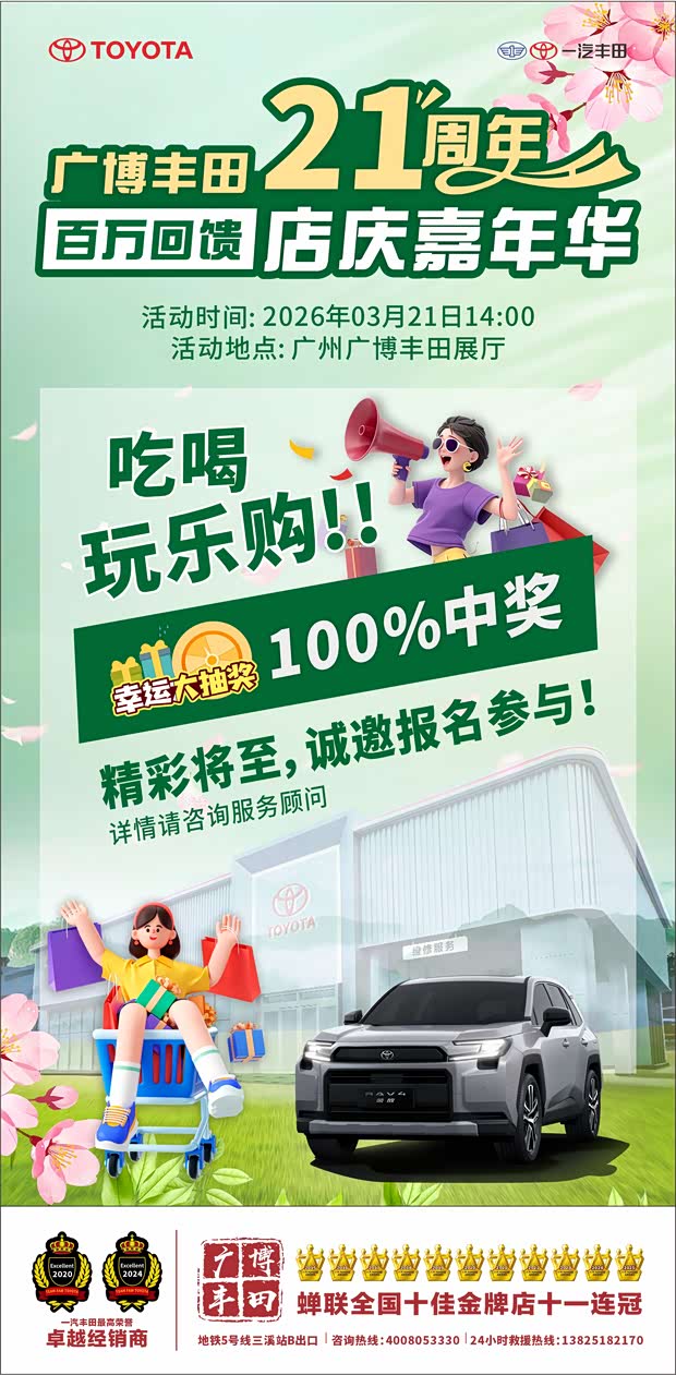 🎉【广博丰田21周年店庆嘉年华】 👨👩👧👦二十一年感恩一路相伴 🎁 百万回馈,吃喝玩乐购全安排 🤩 提前报名参与100%抽奖 📅 3月21日14:00 📍 广州广博丰田展厅 🚗 老友们,咱们不见不散