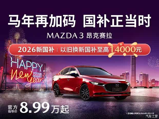 日起,次世代MAZDA3昂克赛拉推出限时惊喜,官方起售价8.99万元,更可叠加享受国家以旧换新补贴至高14,000元。双重力度的礼遇,让标志性的魂