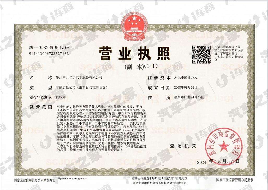【惠阳怡星奔驰】、【惠州中升仁孚-江北店】、【惠州中升仁孚-惠南店】隶属于中升集团,其中惠州中升仁孚汽车服务有限公司于2008年成立,是梅赛德斯-奔驰特许销售及服务中心,集梅赛德斯-奔驰乘用车、G级越野车、迈巴赫、AMG高性能车、EQ纯电动车和福建奔驰商务车、官方认证二手车等销售与售后服务于一体,惠州仁孚在惠州拥有【江北4S店】和【惠南店】两个销售服务点及一个售后服务点,服务于惠州地区十五载的奔驰豪华体验店,目前是惠州地区梅赛德斯-奔驰全品牌授权中心。