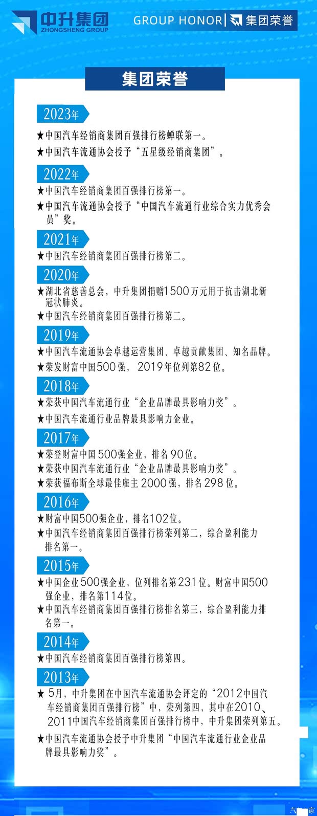 中升集团透过实施未来发展策略及优化现有竞争力,把业务发展推向更高峰,并实现与客户及合作方建立终生伙伴关系的愿景。在此,集团获得了社会的广泛认可;品牌实力雄厚,全国共有412家经销店覆盖超110个城市;