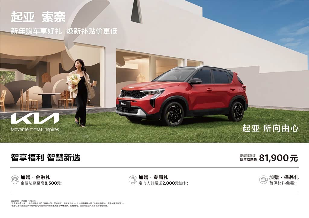 金融礼与保养礼的组合,形成了从购车到用车的完整保护。至高8,500元的金融贴息切实降低了购车门槛,首保材料免费则打消了用车初期的成本顾虑。两项福利相互补充,让消费者在选择起亚索奈时,既能轻松应对购车资金问题,又能安心开启用车生活,充分感受到品牌带来的实用关怀。