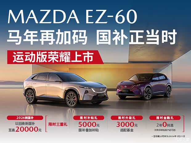 即日起至2026年1月31日,下订购买长安马自达EZ-60/运动版车型,除新国补外还可享限时三重礼!