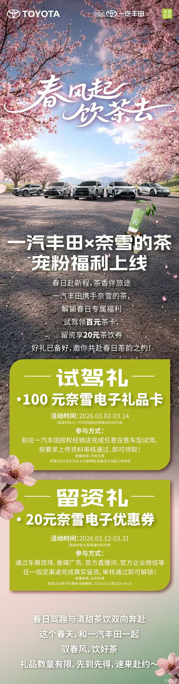 #春风起饮茶去 🎁 一汽丰田 × 奈雪的茶 春日联动 🌸 开车出游配好茶,快乐直接拉满 🚗 试驾领100元茶卡 📝 留资即享20元茶饮券 3月2日-14日 试驾有礼 3月12日起 留资即领 ⚡ 开车饮茶两不误,春日浪漫全拿捏🤏 买丰田就来#汕头华通丰田 🏠泰山路儿童公园北侧(长平油站对面)
