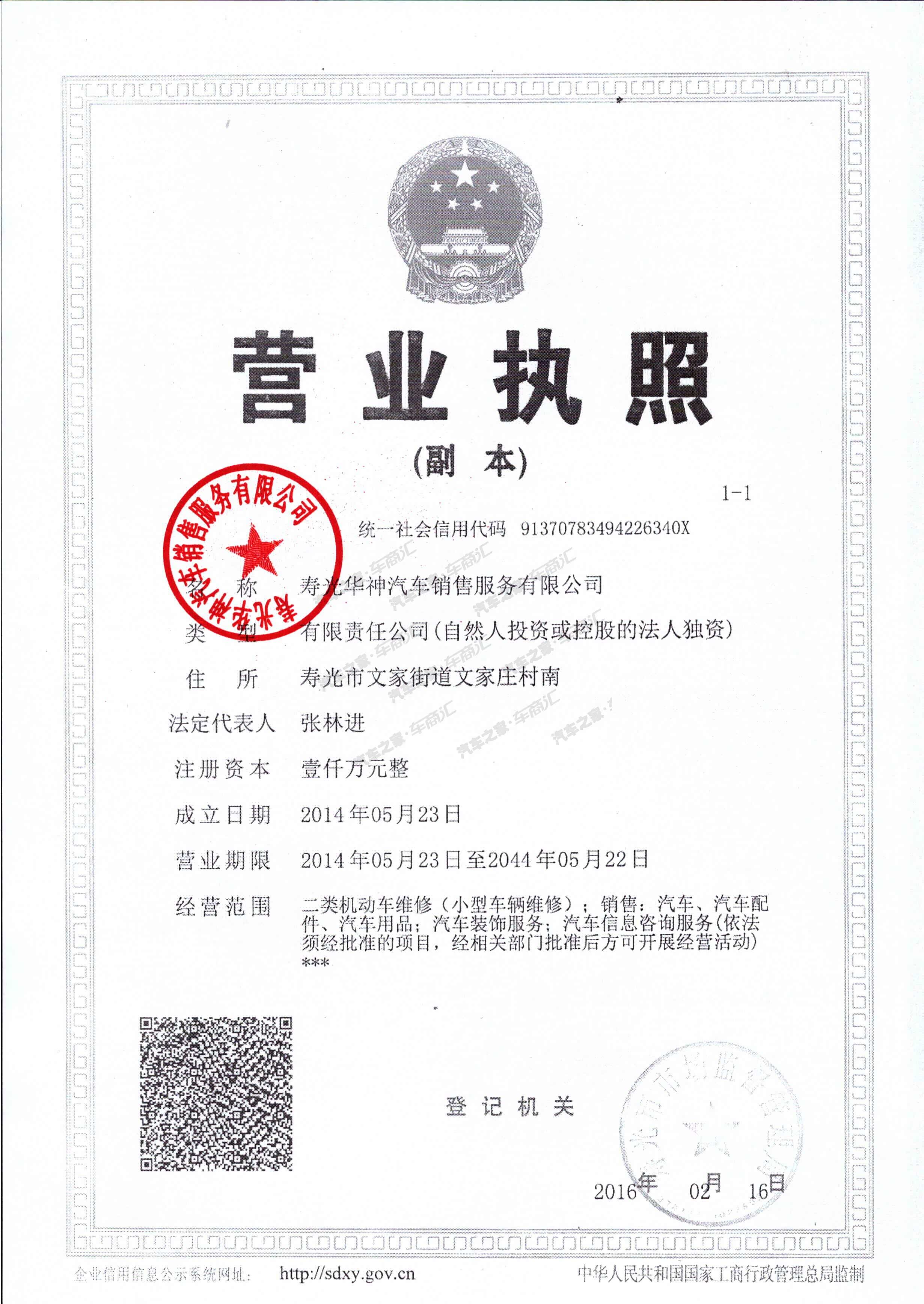 寿光华神汽车销售服务有限公司是广州风神汽车投资集团旗下全资子公司。注册资金1000万人民币。集整车销售、售后服务、信息反馈、配件供应于一体的4S专营店。本店投资近5000万,占地约9000平方米,东风日产寿光华神鼎泰店是东风日产乗用车公司在潍坊地区规模最大的旗舰店,同时也是以“全生态”概念打造的4S专营店。