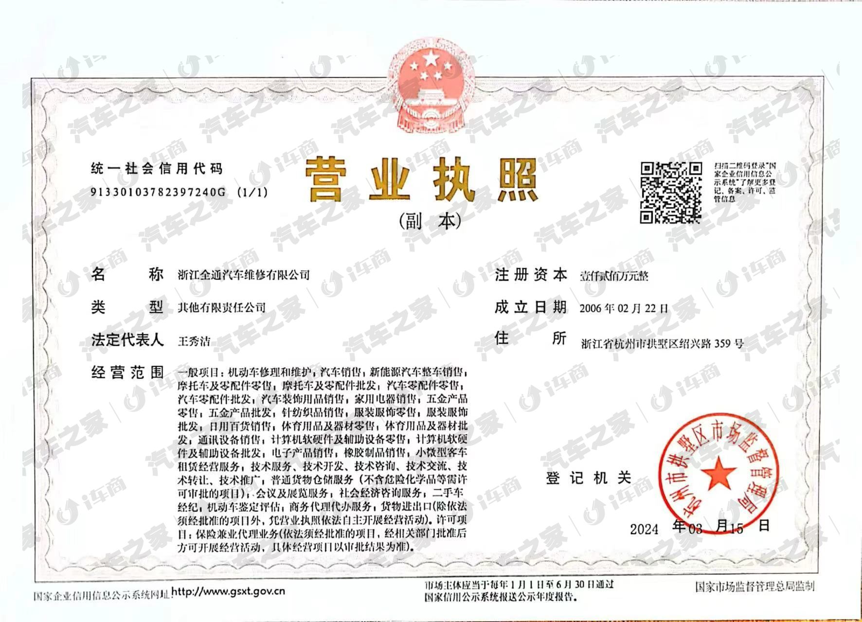 【浙江全通汽车维修有限公司】是集整车销售、售后服务、配件供应、信息反馈于一体的广汽丰田4S店,公司位于浙江省杭州市下城区绍兴路359号,设有产品展示区、业务洽谈区、客户休息区、贵宾休息室、售后服务接待区和维修车间等功能区域,引进了广汽丰田最新检测、维修全套专用设备,为客户提供专业的售前售中售后服务,欢迎车主之家网友来店试乘试驾和在线咨询,杭州全通全体员工将竭诚为您服务。