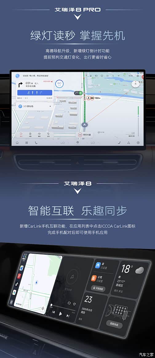 针对不同车型,本次升级还带来专属惊喜:艾v瑞v泽8 PRO同步升级高德导航系统,新增绿灯倒计时功能,帮助驾驶员提前预判交通灯变化、合理规划起步节奏,有效节省通勤时间、规避闯红灯风险;艾瑞泽8则新增CarLink手机互联功能,用户在完成配对后可在车机便捷使用手机应用,实现车机与手机无缝联动,让智能互联更具乐趣。