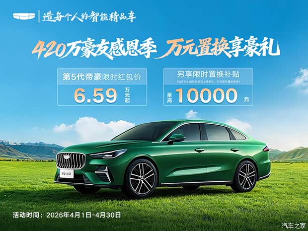 帝豪开展420万豪友感恩季,现在置换第5代帝豪限时享至高10000元置换补贴,还可叠加享受国补,限时红包价6.59万元起,更有4万2年0息贷款或7年优选方案前2年0息,首任车主基础流量免费,3年免费娱乐流量(10G/月),整车及动力总成4年或15万公里质保(限非营运车主)。