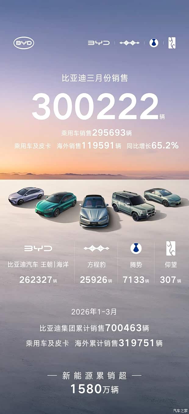比亚迪3月份销售300222辆,获得中国车企销冠