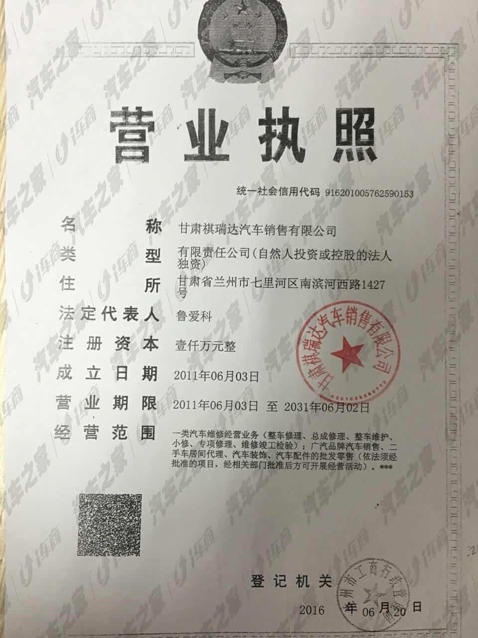 甘肃祺瑞达汽车销售有限公司是广州汽车集团乘用车有限公司授权的甘肃省兰州市的4S店。公司总投资1000万元,是集“整车销售(SALE)、零配件供应(SPAREPART)、售后服务维修(SERVICE)、信息反馈(SURVE)”四位一体功能于一身的现代汽车营销企业。