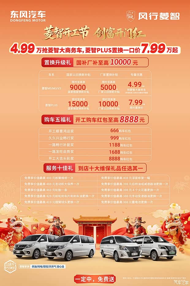精准回应这一现实需求,东风风行菱智重磅推出“菱智开工节,创富开门红”主题活动。从购车礼遇到置换补贴,从红包权益到“服务十佳礼”,多重福利层层加码,真正把开工大吉的诚意,落到每一位实干家的心坎里。