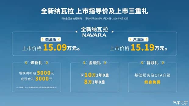 3月26日,在“雨林秘境穿越之旅暨 2026 年春季双品牌新车上市品鉴”活动中,全新纳瓦拉荣耀上市!15.09万起,以国际化全域舒享皮卡之姿,重塑高端皮卡标杆。更有焕新礼、金融礼、智联礼三重好礼限时发放,为追求品质与自由的皮卡玩家带来兼具国ji品质、乘用舒适与全场景实力的出行新选择。