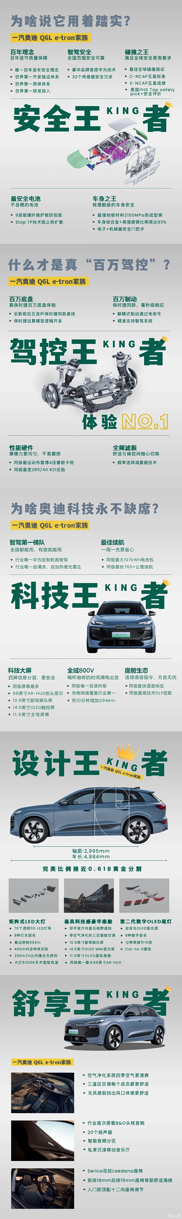 传承百年奥迪的德国精工底蕴,融入中国创新智慧, #奥迪Q6L e-tron 以“科技wang者、安全wang者、驾控wang者、舒享wang者、设计wang者”五大wang者实力,为客户带来更安全、更智能、更舒适的豪华电动出行体验