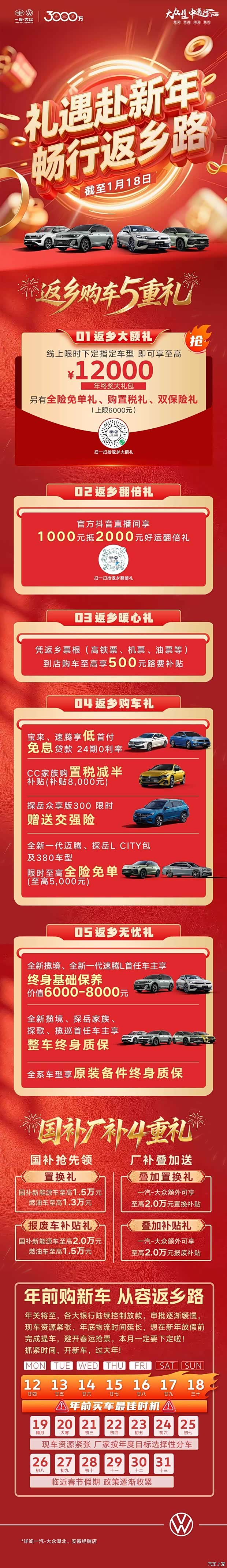 年关渐近,开车返乡成为越来越多家庭的出行首选。为满足消费者新春购车需求,一汽-大众重磅推出"礼遇赴新年畅行返乡路"专项购车活动5重购车好礼及国补厂补双重叠加政策,为用户打造省心省钱的购车体验,活动截止日期为1月18日。