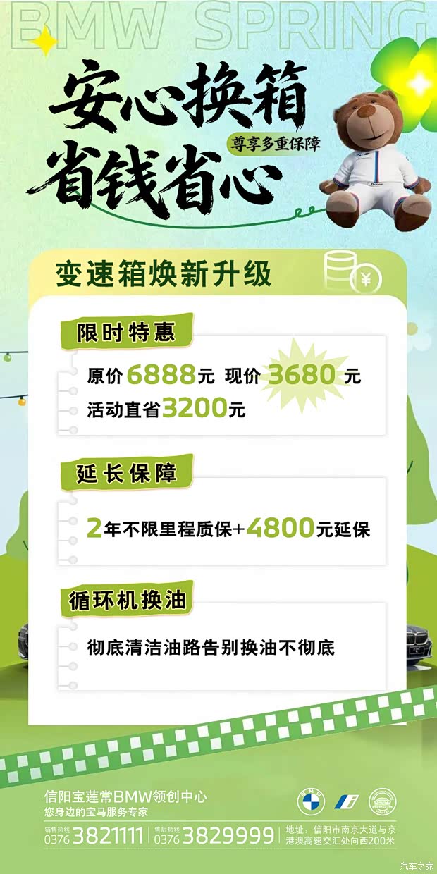 变速箱焕新升级 尊享多重保障 ✅全新变速箱|2年不限里程质保+4800元延保 ✅原价6888元|现价3680元活动直省3200 ✅循环机换油|彻底清洁油路 告别换油不彻底 安心换箱,省钱省心,到店即享!