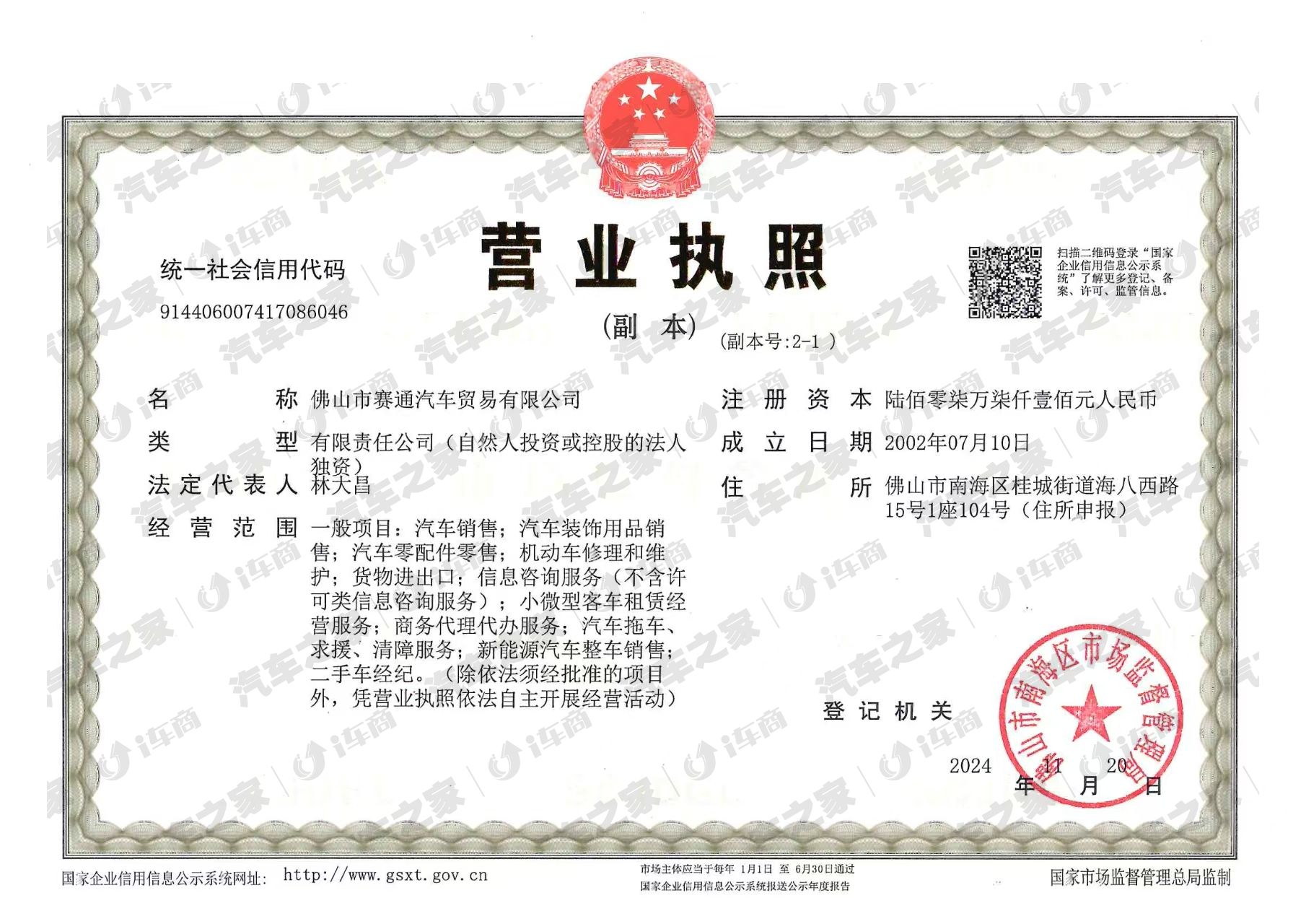 佛山市赛通汽车贸易有限公司成立于1999年,代理长城汽车品牌并在佛山车城,海八路华南汽车城分别设点。19年专业售车、19年专业服务,获得长城汽车厂家颁发的“2000年优秀经销商”、“2002年年度优秀经销商”、“2004年优秀经销商”、及“2007年优胜管理奖”等,最高年销售1600余台。