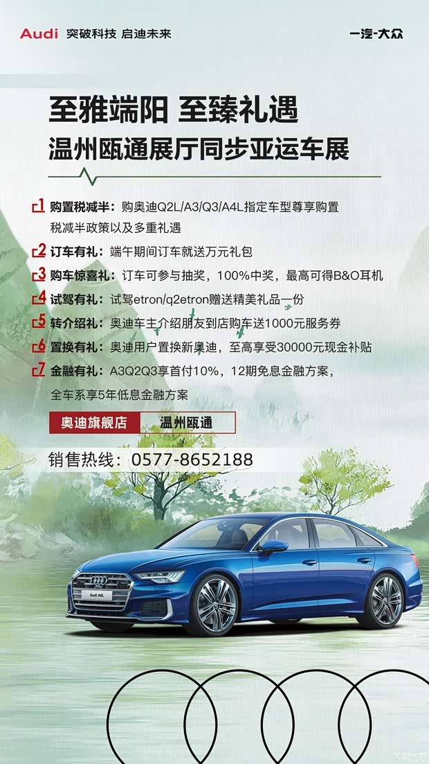 订车有礼:端午期间订车就送万元礼包 购车惊喜礼:订车可参与抽奖,100%中奖,至高可得B&O耳机 etron试驾有礼:试驾etron/q2etron赠送精美礼品一份 转介绍礼:奥迪车主介绍朋友到店购车送1000元服务券 置换有礼:奥迪用户置换新奥迪,至高享受30000元现金补贴 金融有礼:A3Q2Q3享首付10%,12期免息金融方案,全车系享5年低息金融方案 A3Q2专享礼:购奥迪A3Q2享2000元油卡